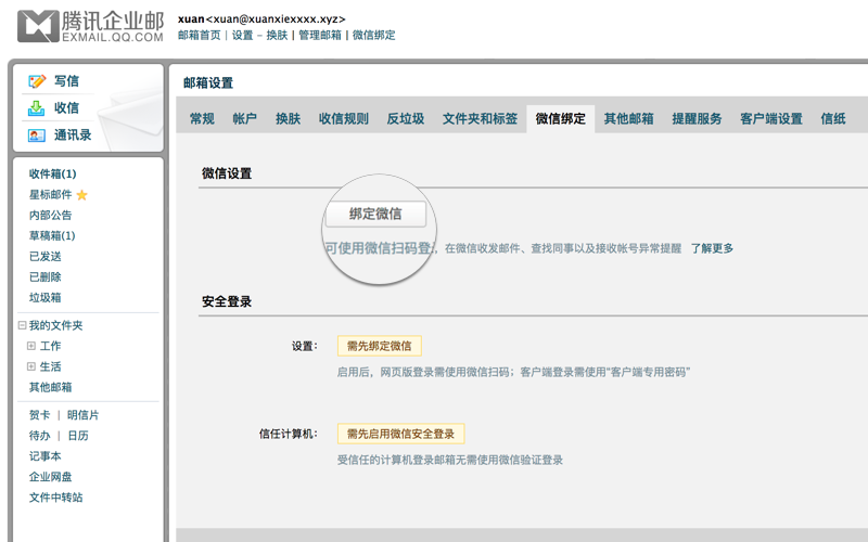 1.企業(yè)成員登錄郵箱后,選擇帳號(hào)下方的“微信綁定”入口或者進(jìn)入“設(shè)置”-“微信綁定”-“微信設(shè)置”,點(diǎn)擊“綁定微信”。