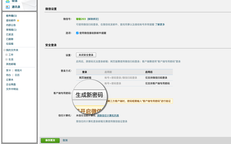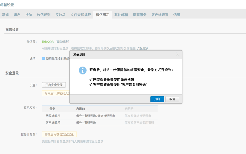 開啟后,將進(jìn)一步保障你的帳號(hào)安全,登錄方式升級(jí)為:網(wǎng)頁端登錄需使用微信掃碼;客戶端登錄需使用“客戶端專用密碼”,?更有效保障你的郵箱安全。
