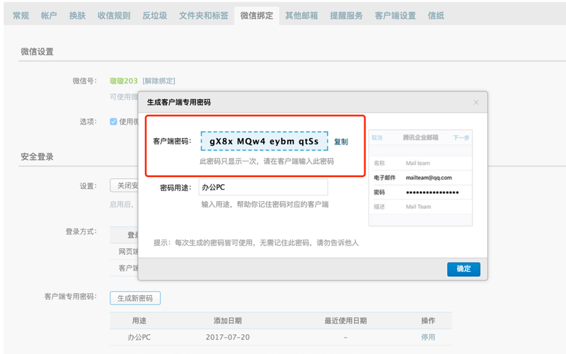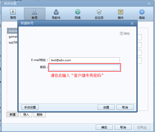 5.生成密碼后,在客戶端端登錄的時(shí)候在密碼看輸入該“客戶端專用密碼”,下面以Foxmail為例: