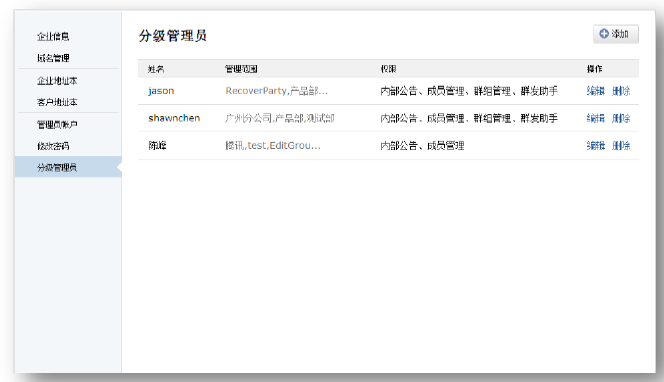 分級(jí)管理員擁有部分如:成員管理,分組管理,內(nèi)部公告權(quán)限。