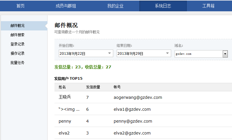 通過“系統(tǒng)日志”功能,企業(yè)管理員可方便的了解到企業(yè)郵箱的整體使用情況。包括成員收發(fā)信的狀況,管理員操作記錄等。