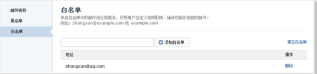 管理員可以將某個(gè)郵件地址,或者是某個(gè)域名設(shè)定為白名單,設(shè)定后,就能確保該地址發(fā)過來的郵件將不受系統(tǒng)限制。
