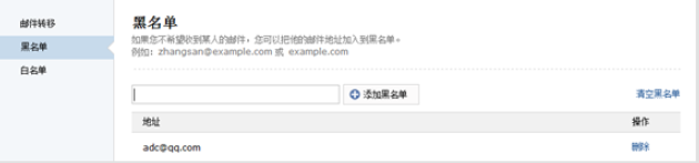 管理員可以設(shè)定某個(gè)郵件地址,或者是某個(gè)域名為黑名單,設(shè)定后將不再收到該地址發(fā)過來的郵件。